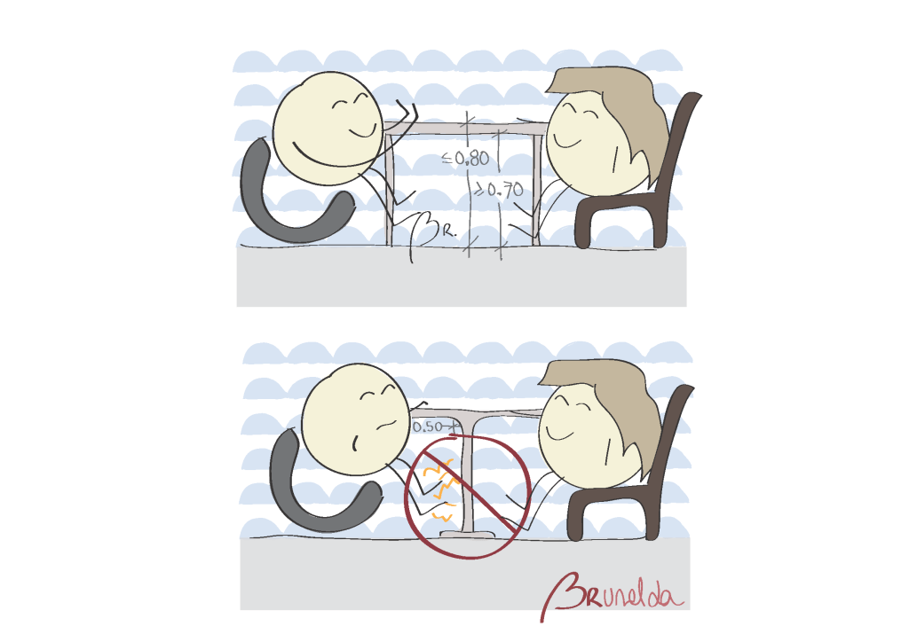 Las mesas, ya sabes, una altura de tablero de 70cm sobre el nivel de suelo y un espacio a la altura de las rodillas (a 60cm del suelo) de 40/50cm y a la altura de los pies (a 15cm del suelo) de 50/60cm
