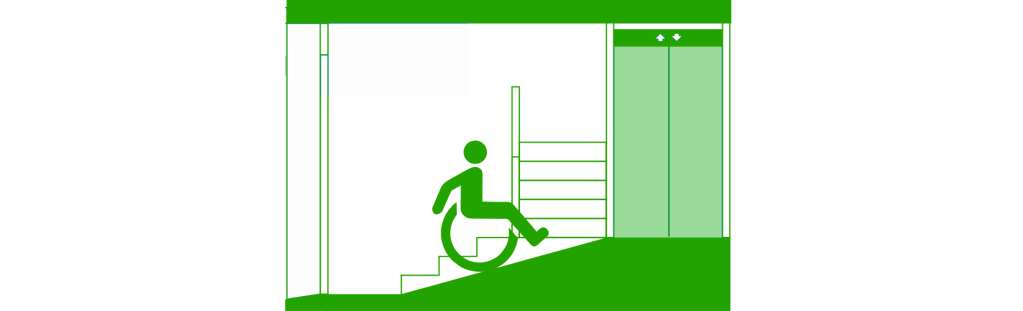 En cuanto a los accesos, el criterio general es que se debe establecer un “itinerario accesible” desde el exterior del edificio (también desde el aparcamiento, zonas comunes, zonas de servicios, etc) hasta la plataforma de ascensores para dar accesibilidad a todas las plantas del edificio.