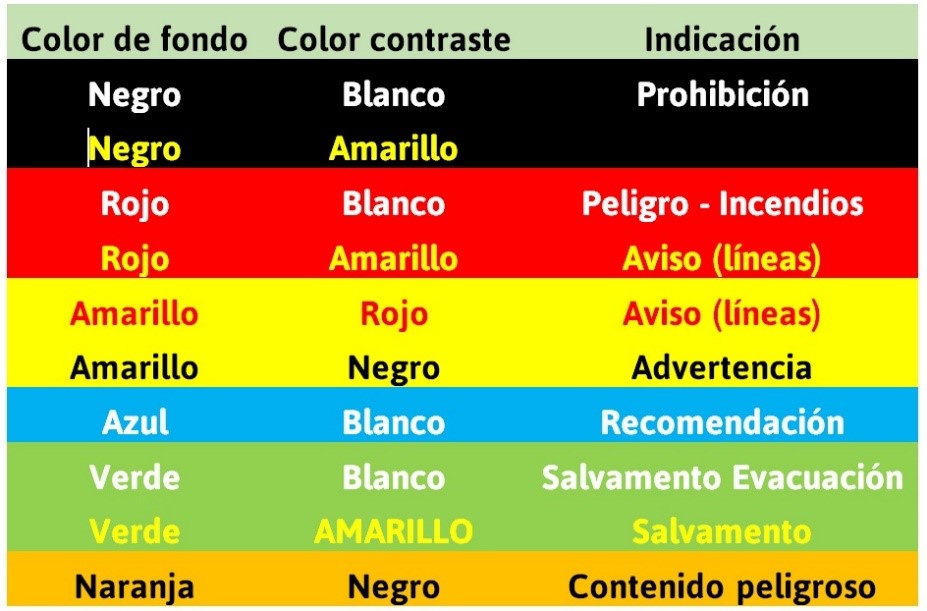 En cuanto a señalización, en el siguiente cuadro se muestran los colores a utilizar en indicaciones de seguridad, su significado y otras indicaciones sobre su uso.