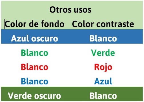 Cuando deseamos emplear un contraste de color garantizado, podemos utilizar los de la siguiente tabla en la que aparecen textos de color sobre fondos contrastados y su utilización más habitual.