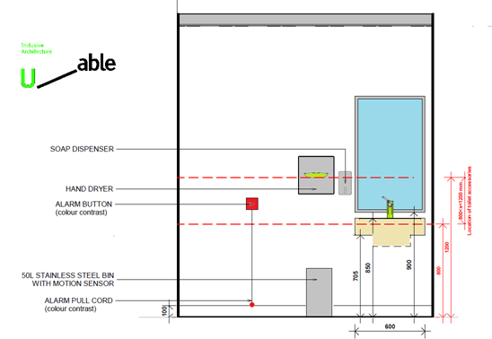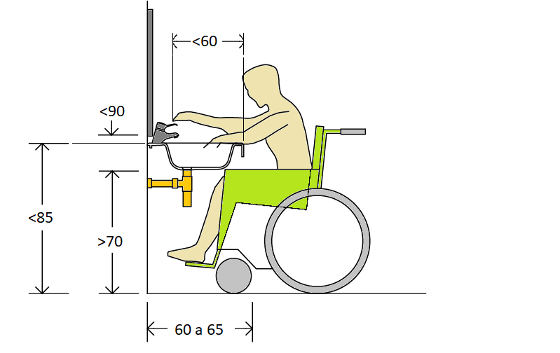 Las partes operativas como el secador de manos, toalleros, jabonera, etc se deben situar de manera que el accionamiento quede a una altura entre 80 y 120cm y si se deben utilizar a la vez que el lavabo o fregadero, sitúalos a una distancia menor de 60cm del aparato.