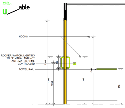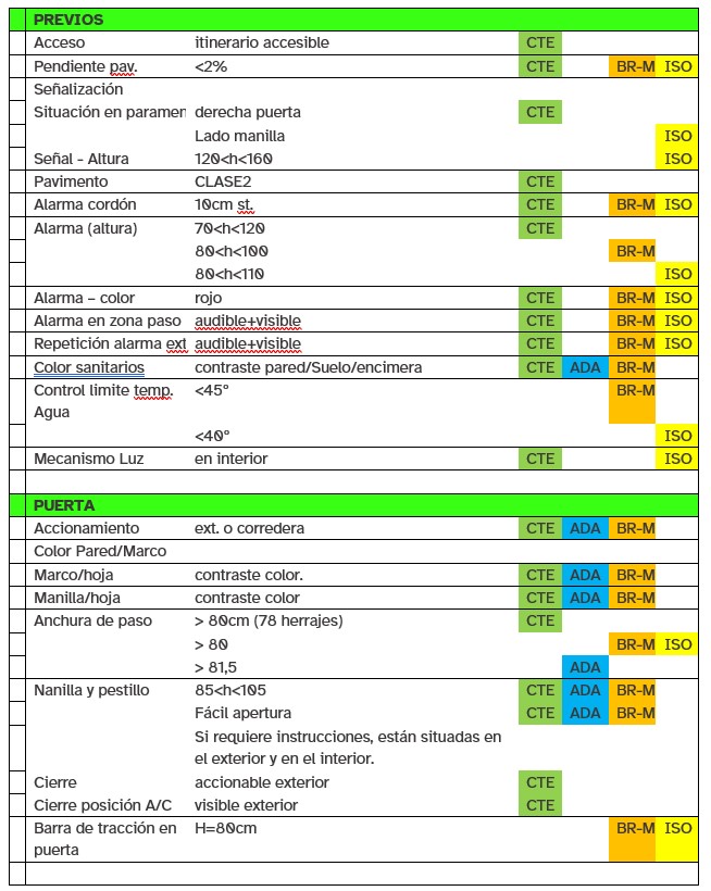 - Puerta accesible, con anchura de paso 85cm (78cm mínimo contando quicios y herrajes), altura mayor de 200cm, con la manilla de accionamiento situada a 90/110cm del suelo y con un espacio mínimo entre la manilla y un paramento perpendicular de 30cm.