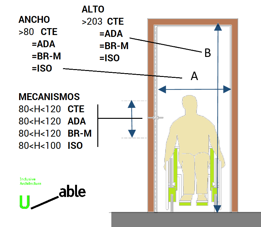 - Puerta accesible, con anchura de paso 85cm (78cm mínimo contando quicios y herrajes), altura mayor de 200cm, con la manilla de accionamiento situada a 90/110cm del suelo y con un espacio mínimo entre la manilla y un paramento perpendicular de 30cm.