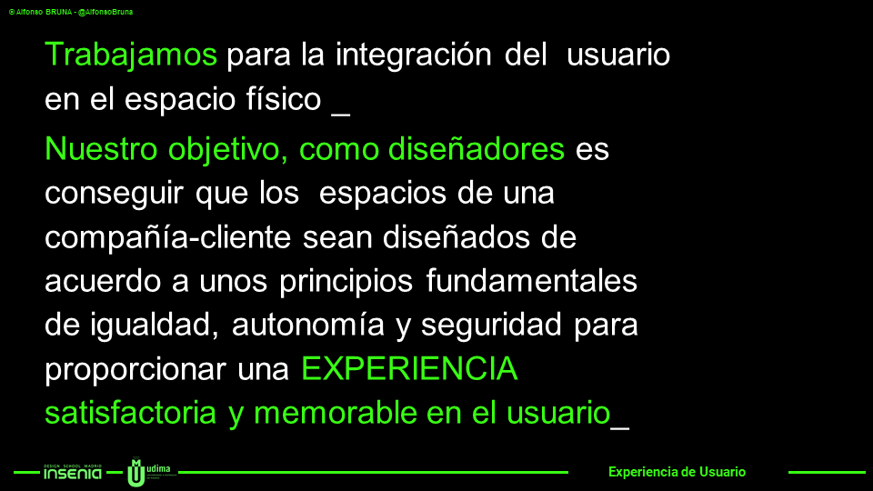 Nuestro objetivo – como diseñadores – es crear espacios de acuerdo a los principios de #Igualdad, #Autonomía y #Seguridad y no solo porque formen parte de los “requisitos básicos de la edificación” expresados en la LOE, Ley (española) de Ordenación de la Edificación, la más importante Ley que regula en el reino de España la actividad de la edificación y que puede llevarnos a la cárcel si no hacemos las cosas suficientemente bien o que #Igualdad, #Autonomía y #Seguridad estén dentro de las “exigencias básicas” del CTE, Código Técnico de la Edificación que es el encargado por la LOE para asegurar que se satisfacen esos “requisitos básicos de la edificación”, sino porque con nuestro diseño podemos (debemos) proporcionar una experiencia satisfactoria y memorable en el usuario, lo que redundará en una mayor eficacia y calidad de ese espacio.