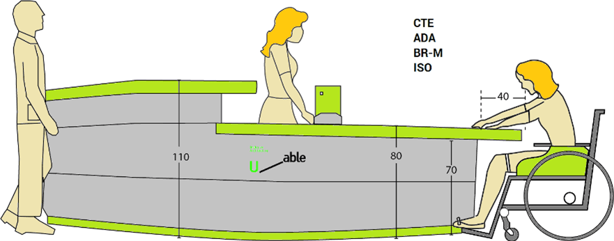 La encargada del diseño de un importante proyecto (gracias Conchi) nos hace una consulta sobre cómo puede diseñar un “mostrador de atención” que sea accesible sin que sea demasiado grande, tenga espacio de trabajo para 4pax y que cuando presentó este diseño a la empresa cliente recibió un comentario parecido a “¿dónde vas con ese mostrador tan grande?, con 4m para las personas que atienden, con su peto para cubrir el frente esta perfecto… ¡y ya¡.