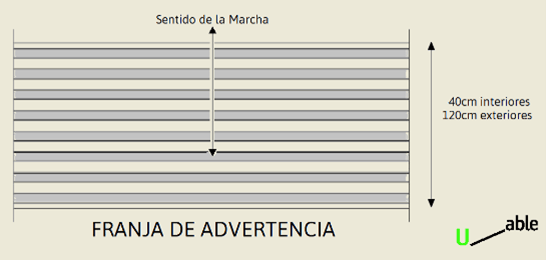 - Le solemos llamar “franja de peligro”. Se trata de una franja de todo el ancho que representa el peligro y una longitud de 80cm. Físicamente se compone de dos franjas de encaminamiento colocadas en el sentido perpendicular a la marcha.
